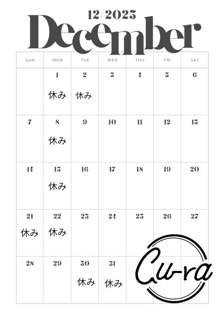 12月はすでに土日の方から予約が埋まってきておりますので、早めのご予約をおすすめ致します。