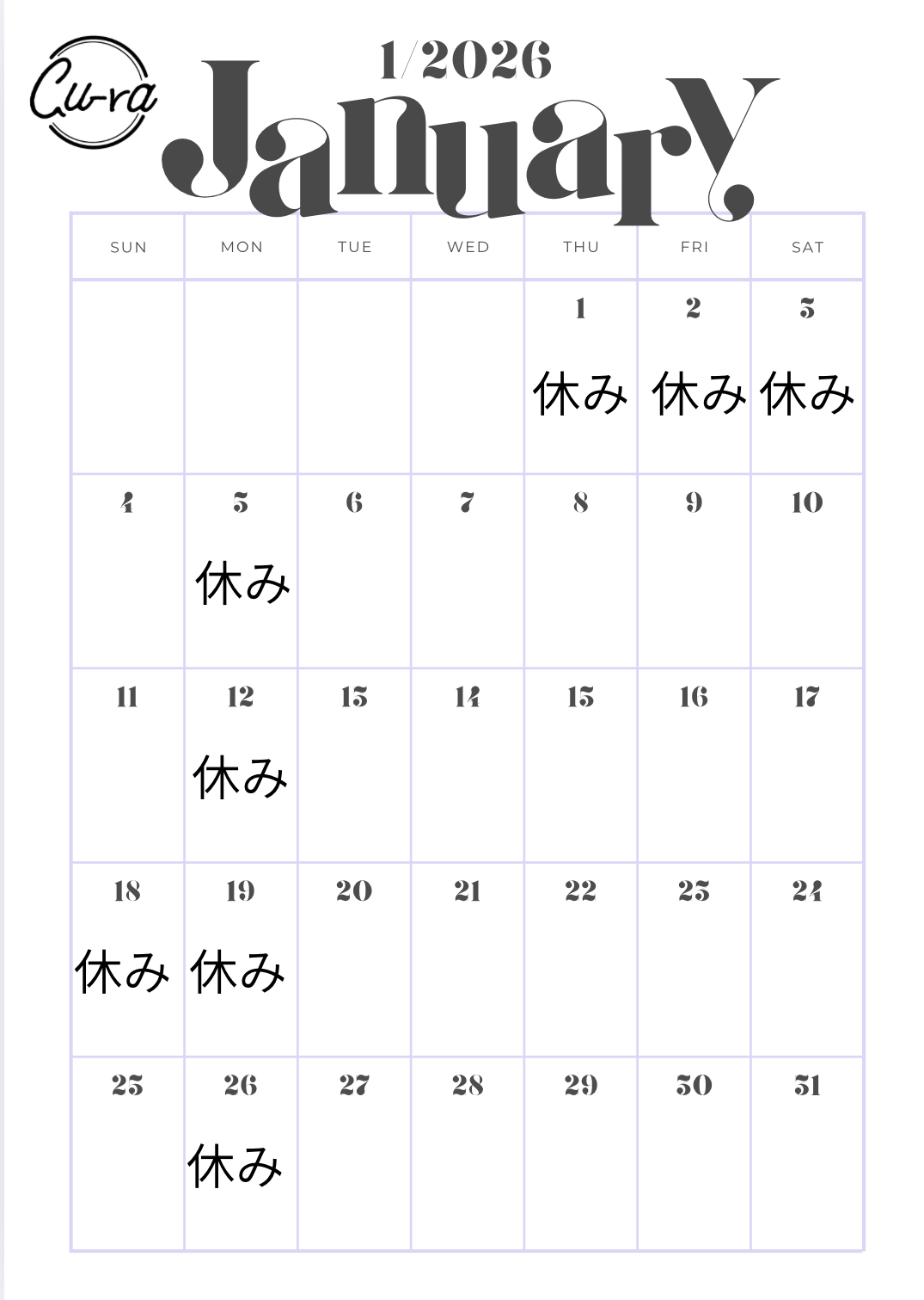 1月は毎週月曜日、18日日曜日がお休みになります。