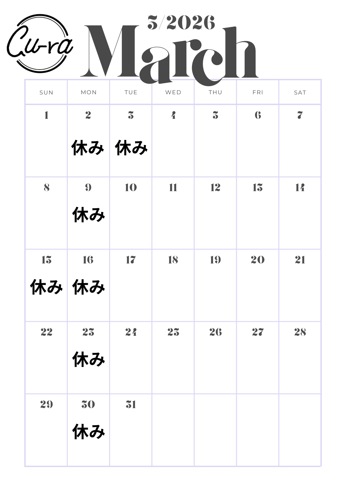 3月のお休みのご連絡になります